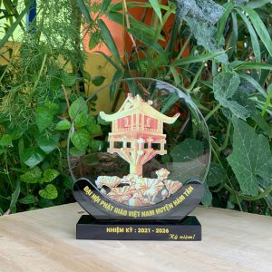 Kỷ niệm chương lưu niệm được làm từ chất liệu pha lê, thủy tinh, gỗ...